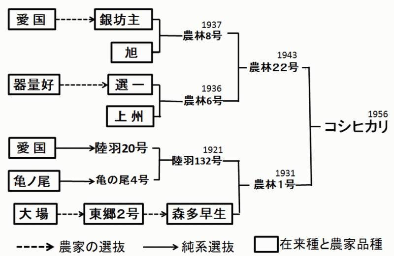 コシヒカリは農林22号を母親とし、農林1号を父親とする交配から生まれた。農林22号は1943年に兵庫県農業試験場で育成された品種で、少肥、多収、良品質でいもち病抵抗性が高く、1945年には1万5000ha近くが栽培されていた。農林22号は数多くの品種の親となった品種で、農林番号品種では21品種、県の育成では十数品種を生んでいる。