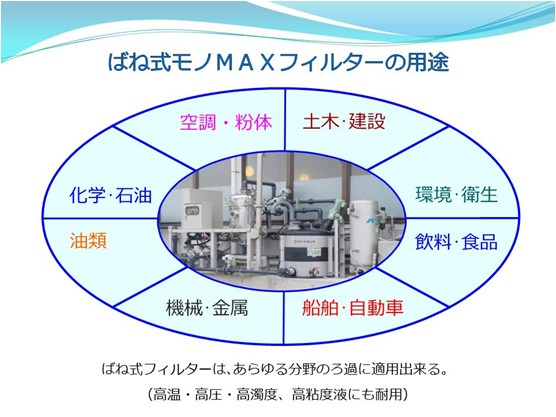 メンテナンスが簡易で運用コストが超安価、水系、油系、薬液類、ガス類等あらゆるろ過作業に活用出来る高機能でノン産廃物型の多目的フィルターとして産業界や学会の高い評価を得ている。船舶のバラスト水浄化や各種大型プラントへの活用等、注目事項は多彩である。