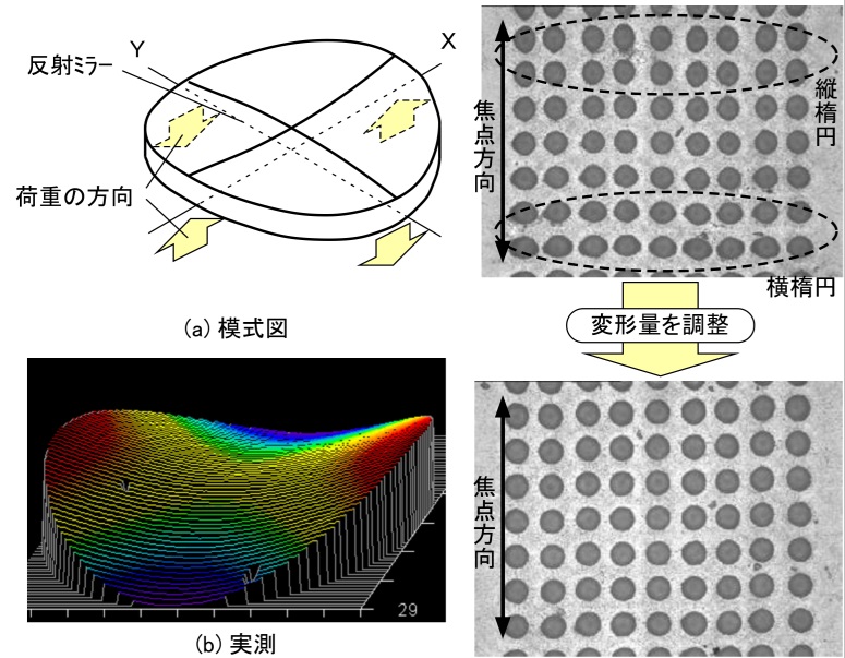 両端でピッチの異なるネジ一本を回転させるだけでレーザビームの反射面を鞍型に変形できる簡便な構造を考案した(図1参照)。このミラーでビームのひずみを補正して、集光形状を楕円から真円に補正する。考案した構造によれば、ネジの回転により、ミラー裏面のX軸両端に正、Y軸両端に負の荷重が印加され、X軸方向には凹、Y軸方向には凸の変形が生じる。この鞍型変形により、楕円ビームが円形へ修正される(図2参照)。