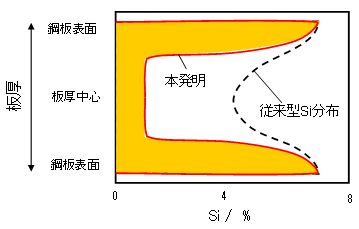 電磁鋼板はモータやリアクトル等の鉄心材料として用いられているが、電機機器における動作周波数の高周波化に伴い、高周波域での鉄損低減が求められている。高周波での鉄損を低減するためには、固有抵抗増加元素であるSi添加が有効であるが、同時に磁束密度の低下、加工性の劣化等を招く。そこで、高周波域で渦電流が集中する表層のみSi濃度を高めることを着想した。