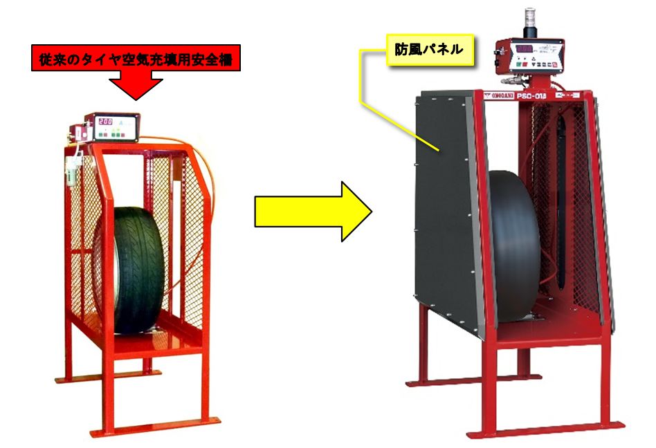 本発明は、空気充填作業時に、タイヤが破裂しても爆風や破片の飛散を防ぐために、従来の空気充填用安全柵に防風パネルなるものを有し、爆風を作業者のいない安全な方向に導くことで、作業者の安全性を大幅に向上させるものである。
