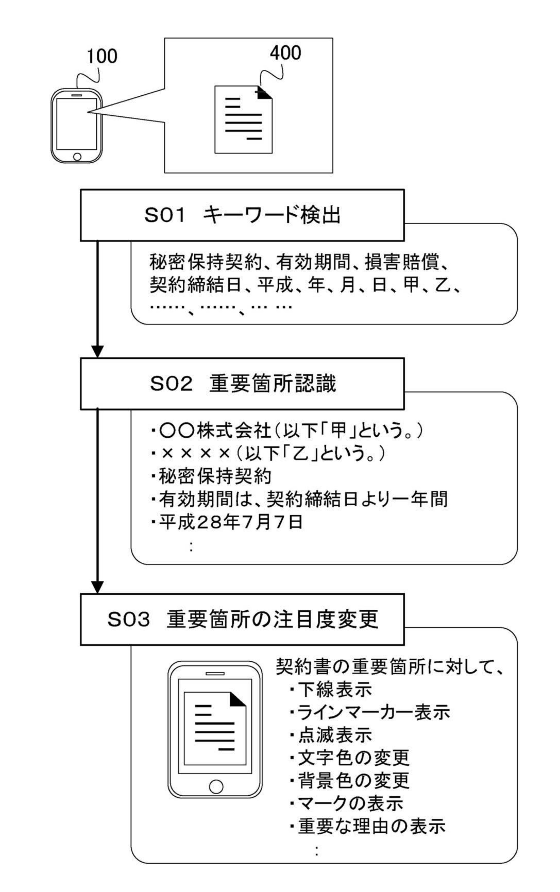 本発明は、契約書の文書解析を行って、契約に関する重要な情報をハイライト表示などでユーザーに明示する(図1)。加えて、契約相手・内容などの観点でのリスクや、それらを考慮した総合的なリスクを明示する(図2)。