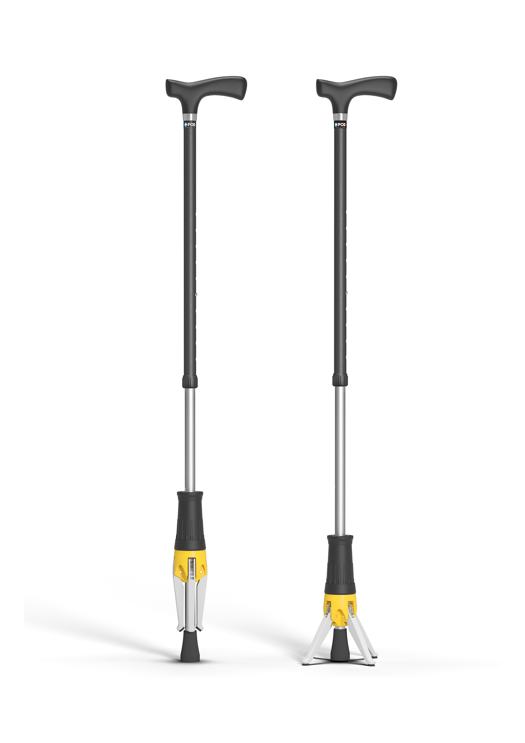 杖先の開閉脚は、歩くときには閉じることで純粋な1点杖としてスムーズな歩行ができる。一方で、立てる際には4本脚を開き、十分な脚幅で安定自立が可能となる。このように開閉脚方式とすることで既存の自立型杖の不便な部分を解消した。また、開閉脚の開閉に際しては「回転」、「スライド」の2段階の手動動作で簡単に行えるようにした。さらに、携帯性を損なわないように、シンプルな構造で小型、軽量化を実現した。