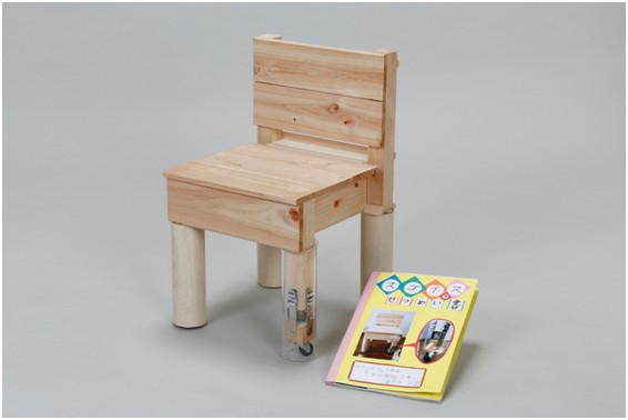| この作品は、座ると体重によって動かなくなるイスです。普段はキャスターで楽に動かせますが、座るとイスの四脚に仕掛けてあるバネが縮み、キャスターが脚のパイプに収納される仕組みです。お母さんが掃除のときに、家にある重いイスを動かすのに困っていたので、キャスターを付けようと思いつきました。でも、キャスター付きは小さい妹には危ないと知り、「重いイスでも楽に動かせること」と「小さい妹にも安全なイス」が出来れば、お母さんと妹を一度に喜ばせられると思い考えました。 |