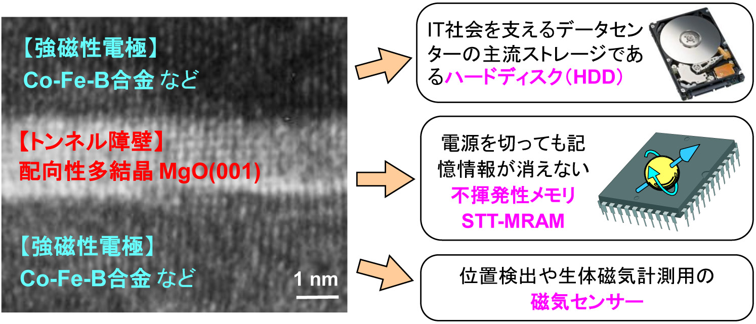 従来のMTJ素子では、トンネル障壁(極薄の絶縁体層)に非晶質の酸化アルミニウムが用いられてきたが、磁気抵抗効果が小さかったためその産業応用は限定的であった。