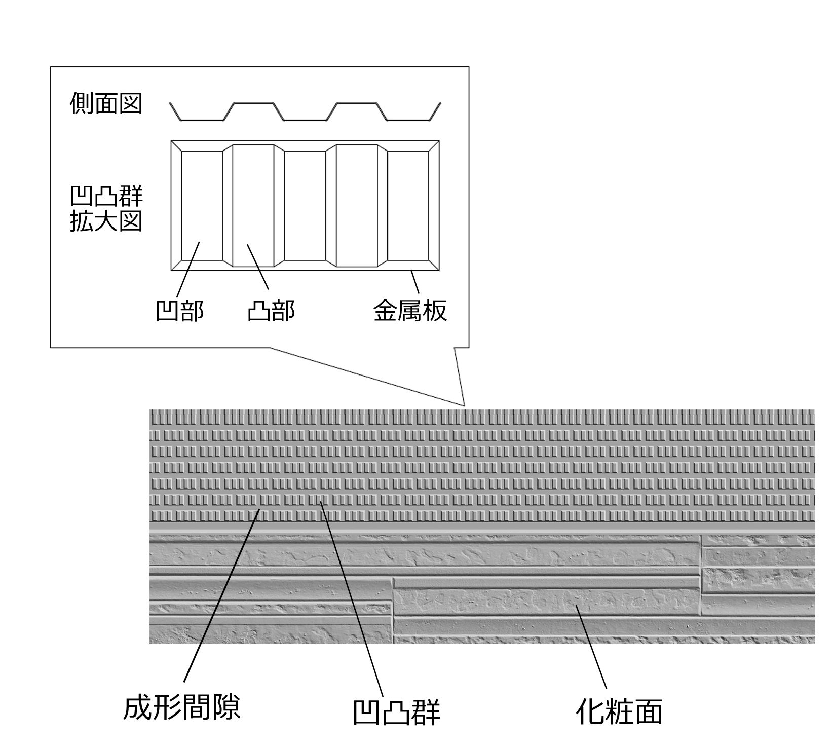 図2 実際に凹凸群を形成した建築用金属外装材の拡大図 |