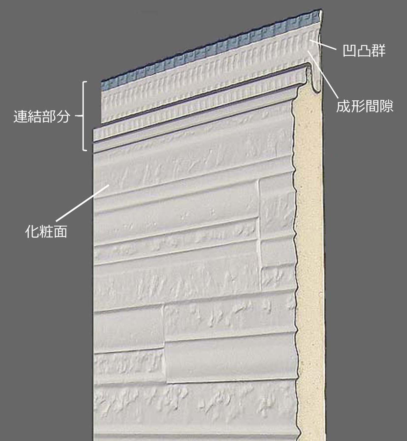 これらにより連結部分にしなやかさを与え、平滑性が求められる柄でも化粧面の歪みの発生を抑制することが可能となった。また、成形間隙は凹凸群と比べて軟らかいため、成形間隙に沿って連結部分を成形加工する場合には、成形機への負荷を軽減し、成形ロールの摩耗を低減することができるため、従来よりも省エネルギーで様々な模様の建築用金属外装材を生産することが可能になった。