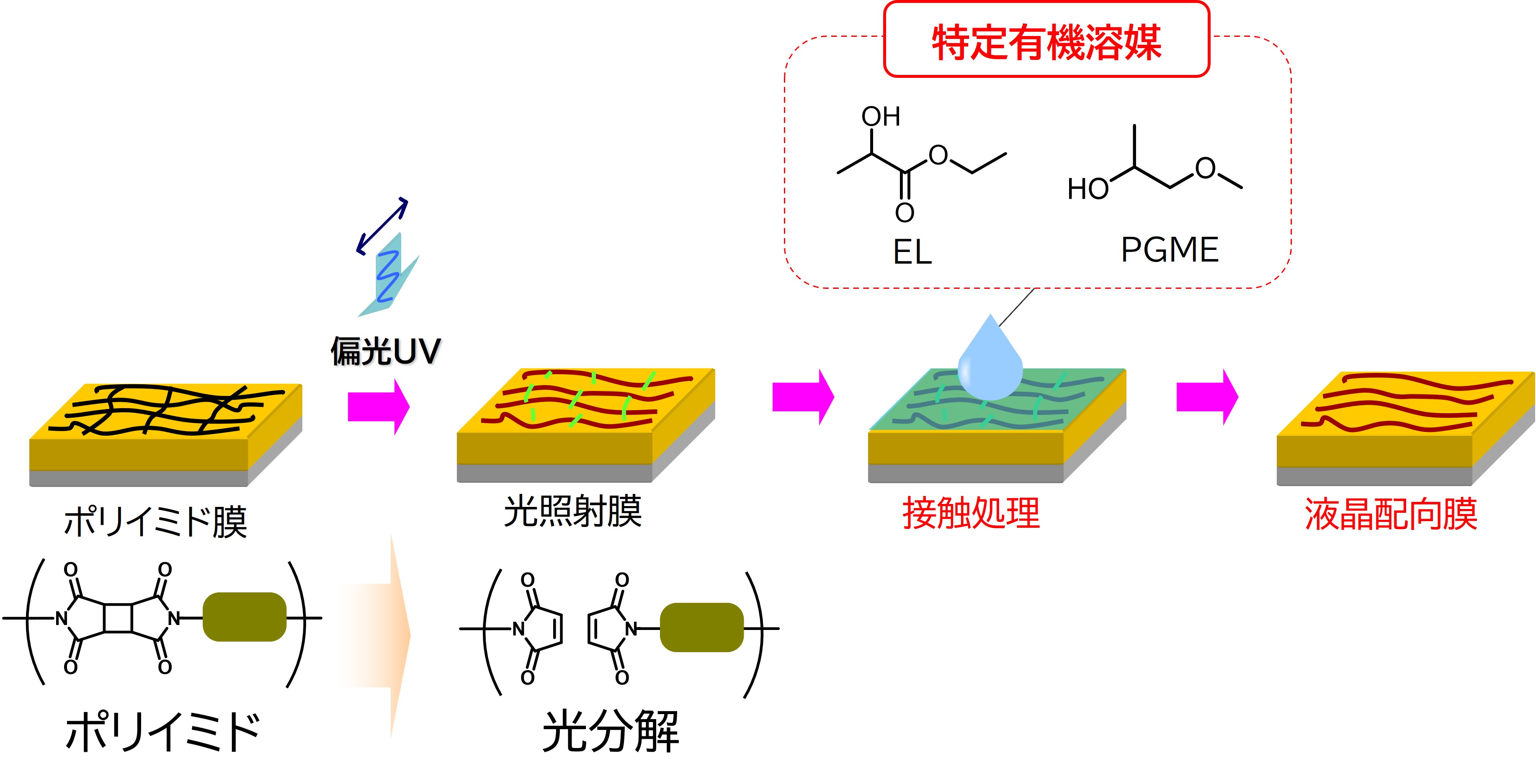 液晶ディスプレイの高精細化、大型化にともない、光配向膜は、画質、歩留まり向上の利点があるため注目されていたが、特に高視野角を確保する液晶ディスプレイにおいて、液晶の配向能力が低いことが、実用化の大きな課題の一つであった。