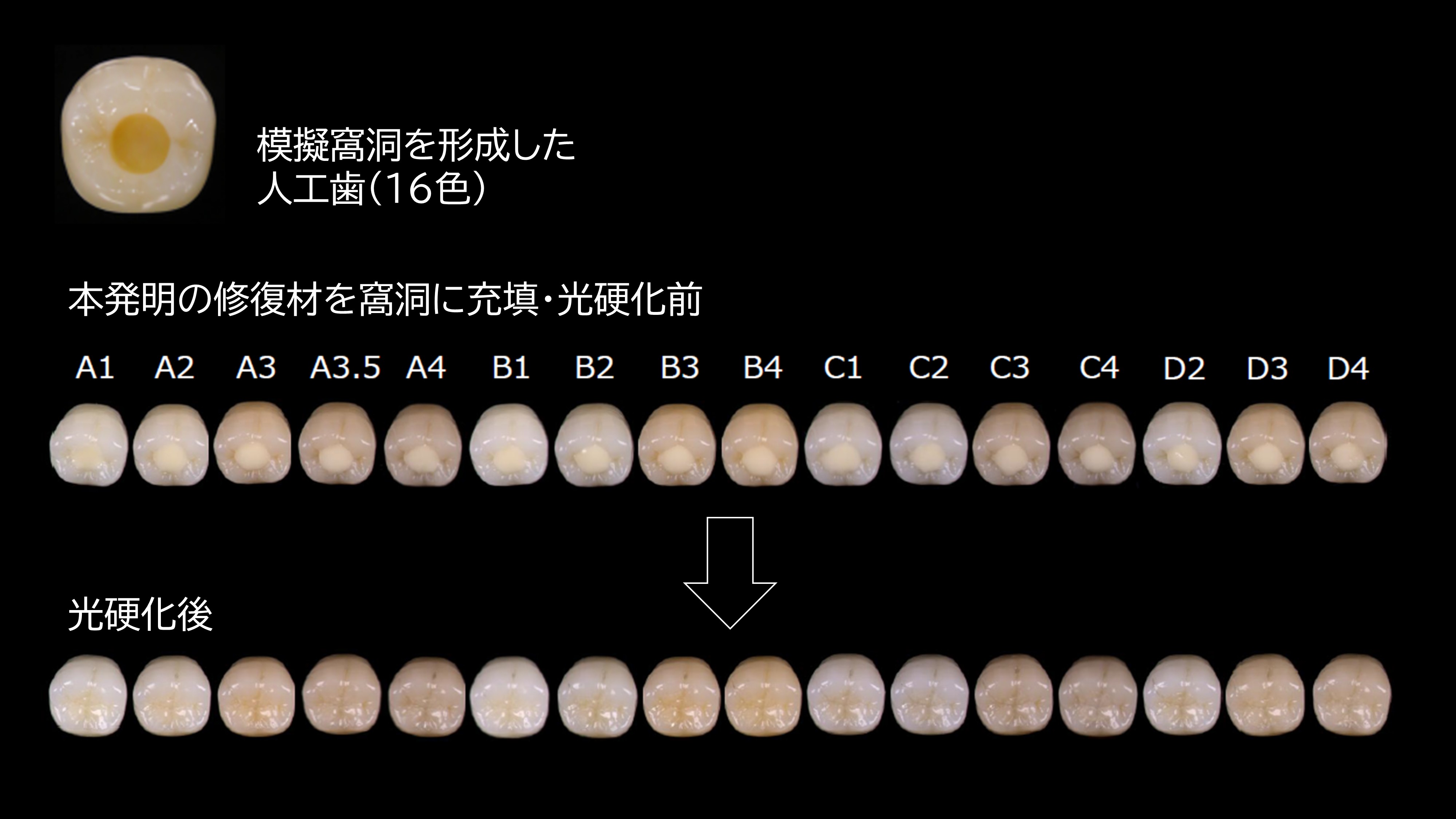 従来技術では、多種多様な天然歯の色調に適合させるために、修復材料中の顔料の配合量を調整することで得られた種々の色(シェード)のコンポジットレジンを準備する必要があり、歯科医師にとってシェード選択や管理等が負担となっていた。