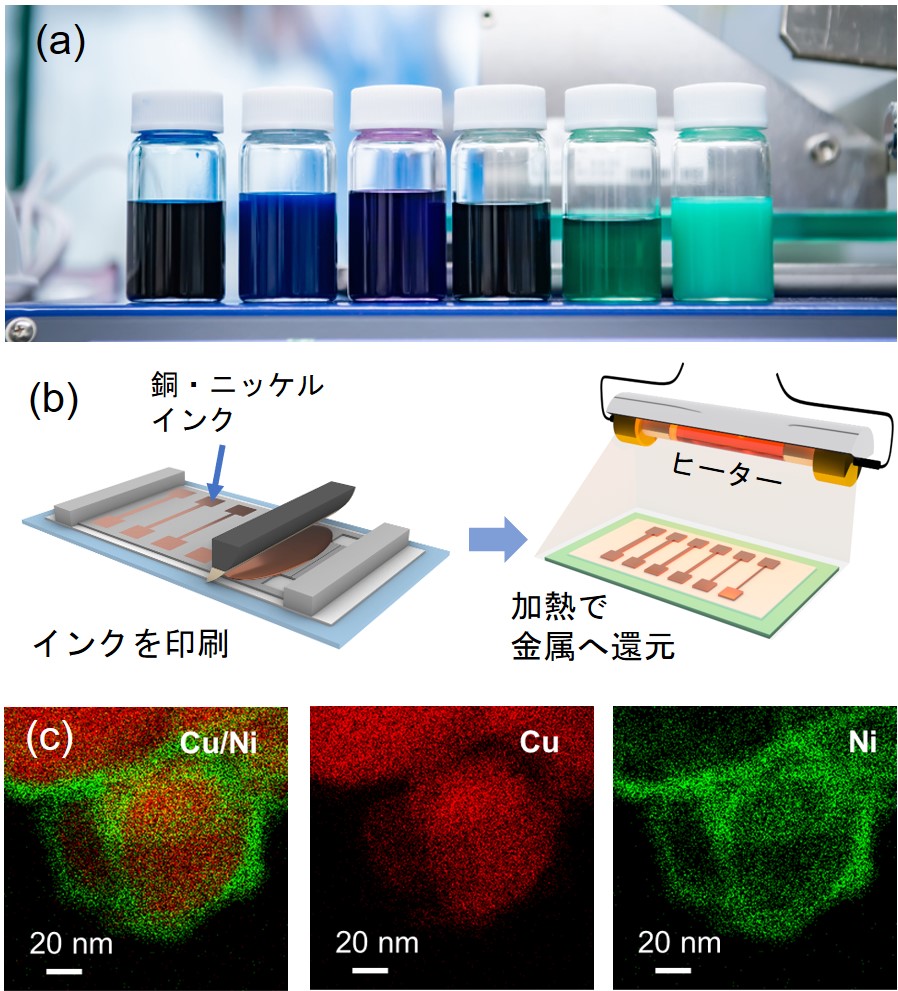 図1 (a) 銅・ニッケル錯体インク (b) 銅・ニッケル錯体インクの印刷プロセス (c) 銅・ニッケル錯体インクのSEM/EDX測定結果 銅粒子の表面をニッケルが被覆することで耐酸化性が向上する |