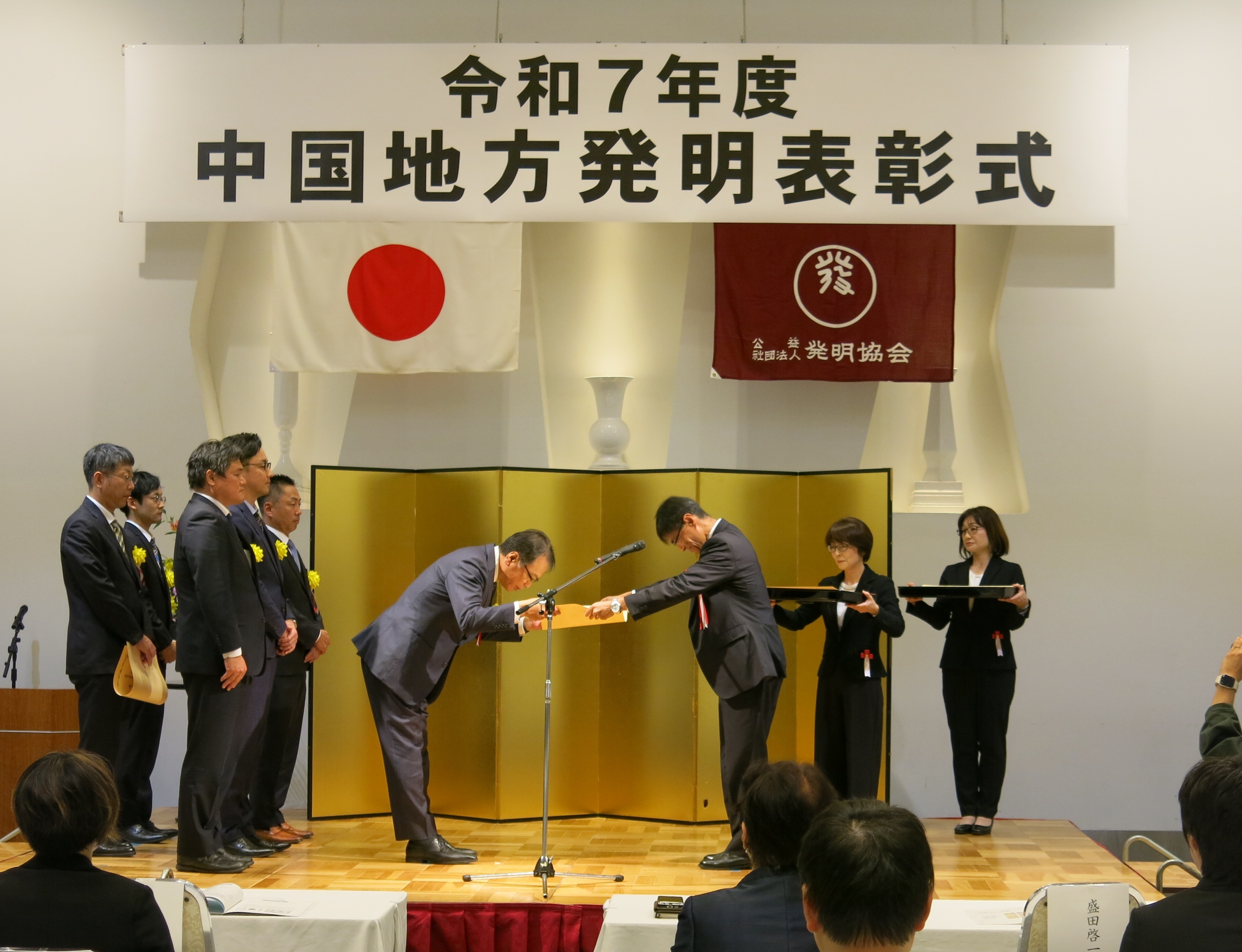 続く表彰では、㈱プロテリアルの本多史明氏ら二名に文部科学大臣賞、中国電力㈱の吉河敏和氏ら七名に特許庁長官賞、㈱木原製作所の木原功一朗氏ら三名に中小企業庁長官賞が贈られる等、各賞が贈呈された。