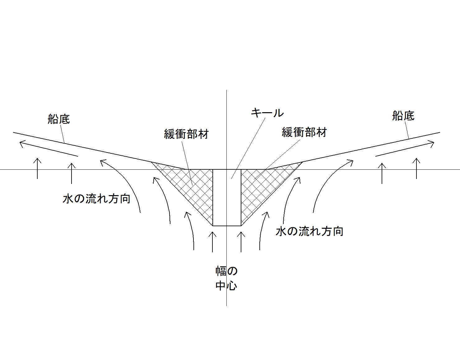近年の小型船舶は軽量化とともに高速化されている一方、積載量と復原性が重視されていることから小型漁船の船底は平坦に近いため、特に波浪中の航行で船首船底部に大きな衝撃を受け船体の損傷や振動の原因になっている。本発明では、多くの小型船の船底に装備されている板や箱状の突出したキールを利用し、船首からの長さ約1/6〜1/4Lの範囲でキール底面から船底に鋭角の三角形を形成する板を装着する。平坦面が減少し水は本装置から着水するため、装置形状に沿った水の流れを作り出し、船底に直接かかる水圧を分散し衝撃を緩和する。