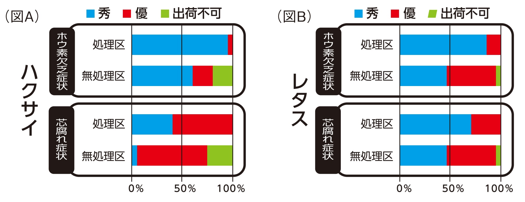 本発明により、レタス・ハクサイ栽培でのホウ素欠乏症状による不良品の発生率が低減した(図A・B)。また、ダイコン・カブ・セルリーのホウ素欠乏症状や、トマトの尻腐れ症状などの抑制・予防効果が認められ、各農業現場で活用されている。