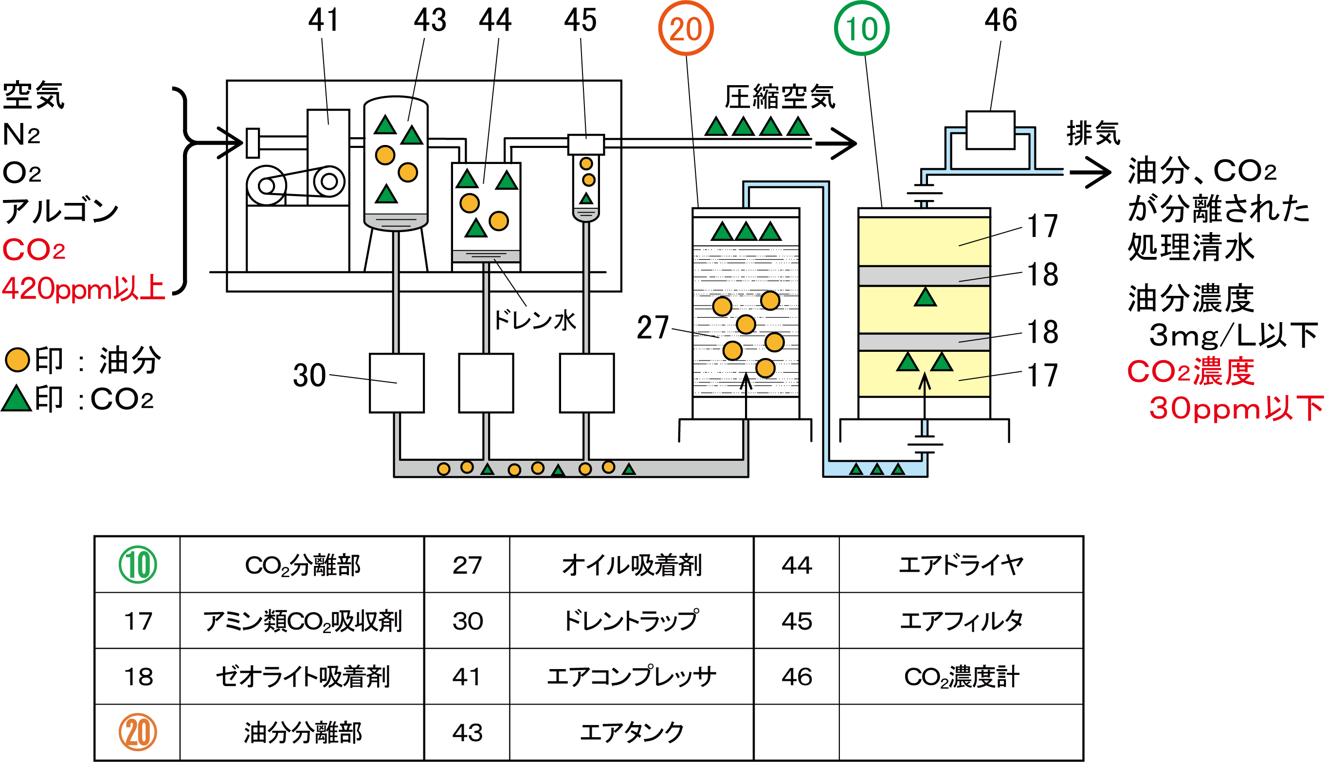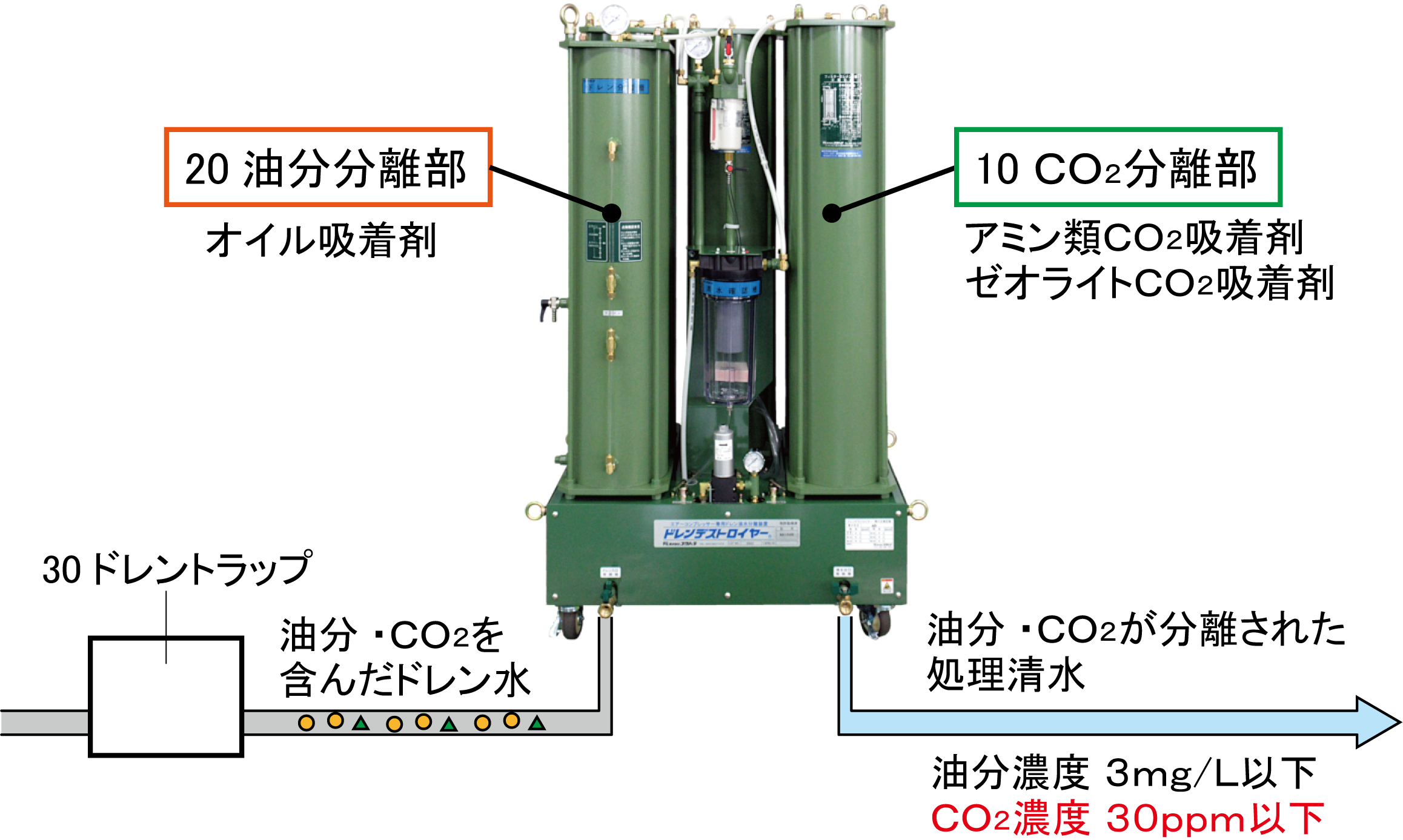 本発明では、アミン系吸収材やゼオライト吸着材を活用することで、ドレン処理と同時にCO2を効率的に吸着・除去できるようにした。また、従来のドレン処理システムにコンパクトに後付け可能な設計とした。さらに、ドレン中の油分や不純物を効果的に除去することで、安定したドレン清水化を実現した。他の動力等を一切使用せず、圧縮空気の力でドレンを油分分離部およびCO2分離部に搬送し吸着処理を行うため安全性が高い。