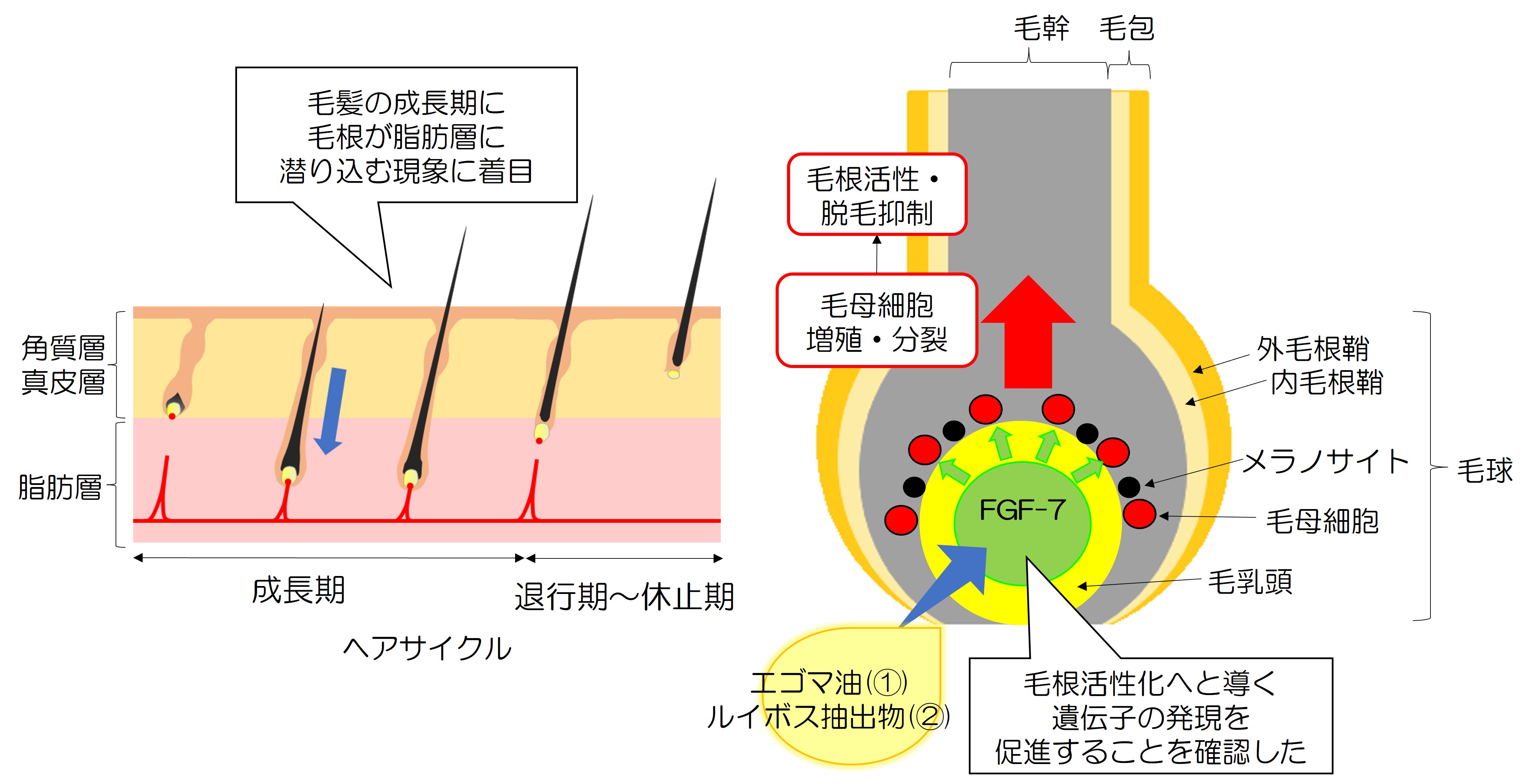 皮下組織に着目し、①が頭髪の成長に重要な役割を担うことを特定するとともに、毛根を取り囲む毛包組織にも着目し、②に頭髪の根元にあたる毛球部へのなじみやすさと育毛効果が期待できることを発見し、①と②とを組み合わせた。油溶性と水溶性という相反する物性を有する中、両成分が共に沈殿せず溶解し、細胞毒性もなく育毛効果を相乗的に発揮できる成分の組み合わせや濃度、混合比を見出した。