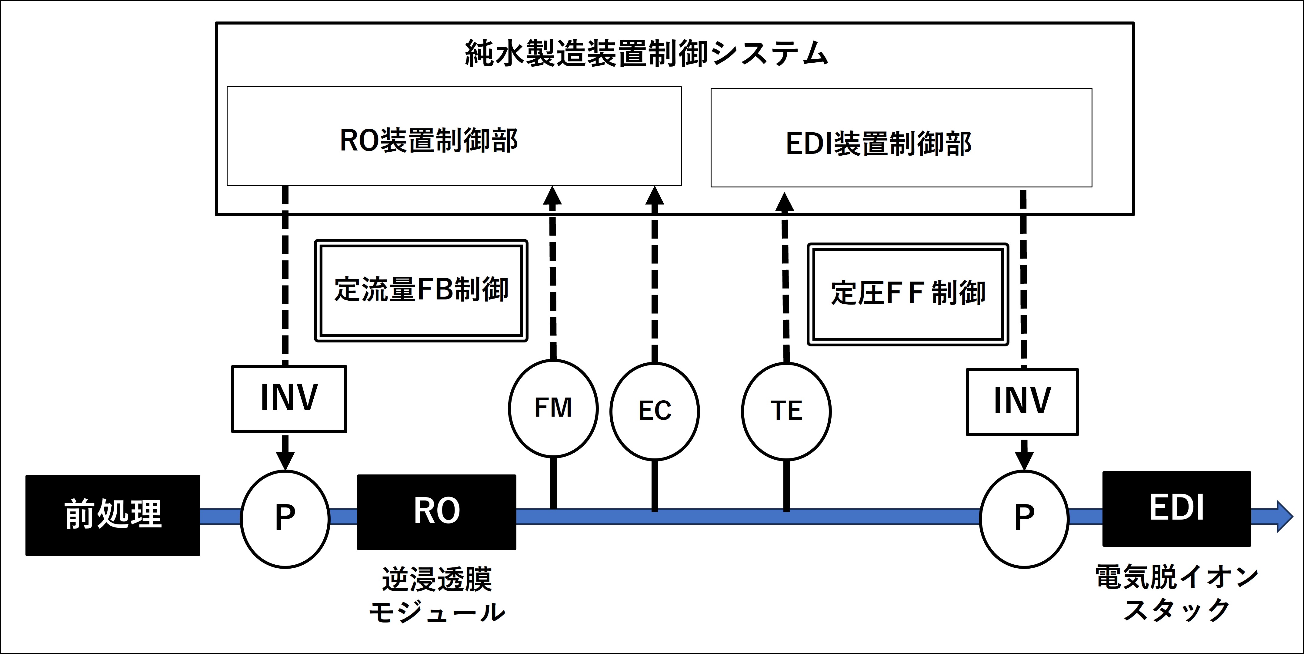本発明は、前段の逆浸透膜モジュールの一次側ポンプを「定流量フィードバック制御」、後段の電気脱イオンスタックの一次側ポンプを水温に応じた「圧力フィードフォワード制御」とすることで、水温によらず脱塩水を一定流量で製造できる。また、水質などの運転状況に応じて脱塩水量目標値を調整することでさらなる省エネ化を実現できる。