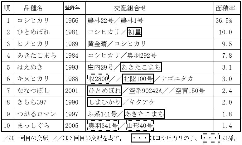 コシヒカリは両親の農林22号と農林1号を越えて最強の交配母本となった。表3に示したとおり、2009年の作付面積上位10品種は全てコシヒカリかその子孫で占められ、その作付面積率の合計は77.5%に達した。コシヒカリが多数回交配母本として利用された理由はその食味を受け継ぎ、弱点の耐倒伏性といもち病抵抗性を改良するためであった。その結果、2位以下の品種は全て耐倒伏性といもち病抵抗性が改良されている。例えばキヌヒカリの交配親である北陸100号はコシヒカリの草丈を短くした突然変異系統である。