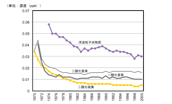 排煙からの硫黄酸化物の除去(脱硫)に革新をもたらしたのが、東北大学の村上恵一教授(以下「村上」と呼ぶ)と堀省一朗教授(以下「堀」と呼ぶ)等により開発された「石灰-石こう法排煙脱硫技術」である。1953年に基礎研究が開始された後、1955年から文部省(当時)の科学技術研究費を受け、工業技術院東京工業試験場(当時)の設備を用いて実用化試験が行われた。さらに、特許の使用許諾を受けた日本産業技術により基礎設計が行われ、翌年、三菱重工により実機が開発された。この技術は、排煙に含まれる亜硫酸ガスを石灰スラリー(懸濁液)に吸収させるもので、副生品として石こうを産出することから、高度経済成長時代の貴重な建材資源を生み出すものとなった。三菱重工業に続いて、国内の多くのプラントメーカーがこの方式を採用し3、この技術は全国に普及し、我が国の硫黄酸化物による大気汚染を劇的に改善した(図1「我が国の大気汚染濃度の年平均推移」参照)、特に、四日市市では、硫黄酸化物の30%がこの技術により回収されたとされている4。また、海外にも技術移転あるいは製品輸出され、世界の排煙脱硫処理のほとんどに採用されるものとなった5。石灰-石こう法排煙脱硫技術は、日本で誕生し、日本で開発された世界の環境問題に貢献したイノベーションである。