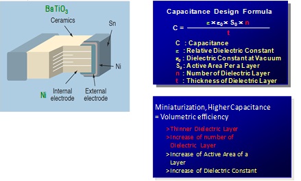 また、MLCCの静電容量は誘電体の誘電率、誘電体素子厚み、内部電極厚みとその積層数、有効面積で決定付けられ(図3)、安価なコストの実現と小型化大容量化はそれらの個々の技術と組み合わせの技術の進化で成り立ち、大きく2つに分けられる。