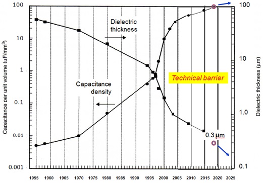 その結果、図111に示すように、誘電体素子は1997年には3μm、2000年2μm、2003年1μmと変遷し、そして2009年には0.7μmと遂に1μm以下の領域に突入した。