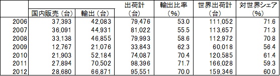 産業用ロボット市場において、日本は1980年以来、わずか10年で生産台数88%、出荷台数75%の世界シェアを誇るロボット大国となった28。2000年代に入ると、ITバブル崩壊およびリーマンショックによる出荷減はあったが、2011年以降では10万台に近い出荷水準に達している。注目すべきは輸出比率の動きで、リーマンショック前後で50%台から70%へと上昇、ロボット産業が輸出主導型に変貌しているのが分かる。これは日本から中国の自動車産業向けなどにロボット輸出が急増しているためである29。近年における世界シェアは、出荷台数で60%、金額ベースでは50%、稼働台数で20%程度まで低下しているが、依然世界一の規模を誇っている。また、精密減速機、サーボモーター等のロボット主要要素部品の供給では9割を超える世界シェアを有する状況にある30。