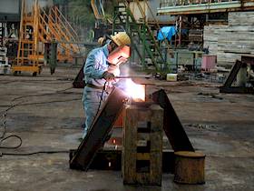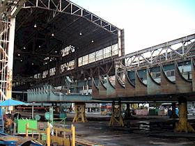 溶接技術の改善・向上により、溶接構造の導入が可能となり、ブロック建造方式が採り入れられた。鋲接構造の場合は、構造部材を船台上に運び、組立て鋲打ち工事を行っていた。溶接工法ブロック建造方式は、船全体構造をブロックに分割し、各ブロックを工場内で完成させその後船台に運び、ブロックを溶接により結合し船を完成させる方式である。各ブロックは工場内で、部品組立て、小組立て、総組立てという過程を踏んで製作されるので、施工の簡易化と精度の確保が大幅に図れることとなった。