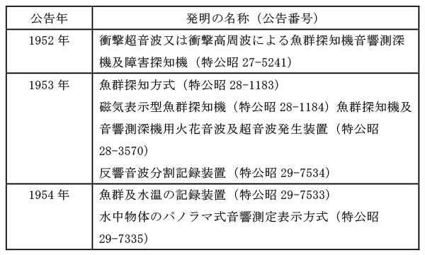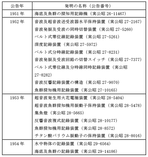 なお、1948年の魚群探知機の発明時、清孝は特許を出願していなかった。このことは、魚群探知機市場に多くの競合他社を参入させることにつながった。魚群探知機における自社の先行優位性を確保し続けるため、清孝は1951年以降数多くの特許および実用新案を出願し取得した(表1及び表2)。登録された特許の件数は34件、実用新案の件数は49件であった。