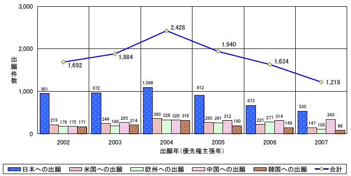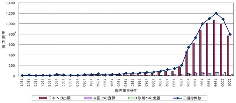 関連特許出願は急激な増加をみせ、日米欧三極特許庁への光触媒関連出願数を見ても1991年段階では二けた台にすぎなかったものが99年には1000件を超え、21世紀に入っては、全世界ベースでは2000件を超えるまでになっている。