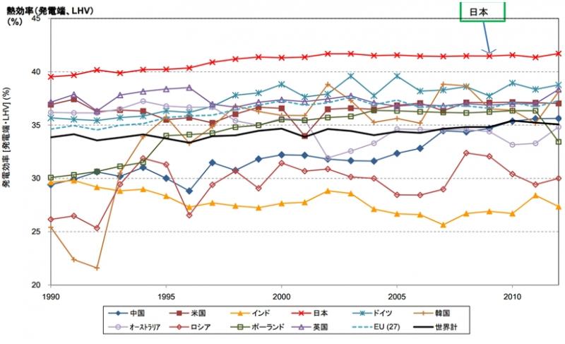 高効率石炭火力発電の開発と導入により、我が国の石炭火力発電平均効率は1992年には40%台を達成し、その後も上昇し続けている。諸外国が現在も30%台にとどまっている中で、我が国はこの分野においてトップの地位を維持し続けている。