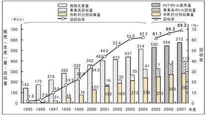 この結果、リサイクル、リユースは国民に広く認識され、例えば90年代初頭にはほぼゼロに等しかったペットボトルの回収率は2007年には7割近くまで上昇するまでになった。