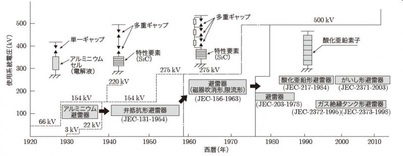 避雷器の歴史は、1900年代初頭の火花ギャップ抵抗形避雷器に始まり、アルミニウムセル避雷器、オキサイドフィルム避雷器などのいわゆる弁抵抗形避雷器が使用されてきた2。