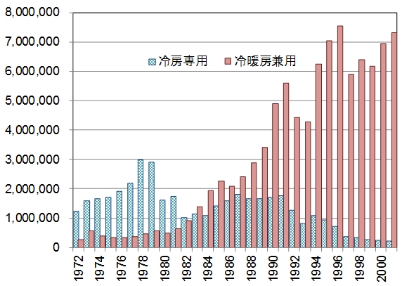 このことは、直ちにエアコン市場にも反映された。それまでのエアコンで主流をなしていた冷房機能エアコンの需要は伸び悩み、暖房機能と冷房機能の双方を備えた冷暖房兼用型エアコンへの需要が急激に増加した。更に、これらの機能が、利便性の高いエアコンの登場を期待していた潜在的エアコン利用者の需要を引き起こすことに成功し、インバーターエアコンの普及に寄与することになった。1982年までエアコン市場をリードしてきた冷房専用エアコンは、1983年にはヒートポンプ型エアコンに逆転され、2000年以降は更にその占める割合を減少している(図1 「家庭用ルームエアコンの国内出荷台数」参照)。