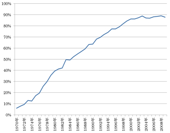 冷暖房兼用型エアコンの市場拡大は、家庭用エアコン自体の普及も加速した。1980年に39%であったルームエアコン普及率(全世帯)は、2000年には90%に迫った(図2「ルームエアコンの普及率」参照)。