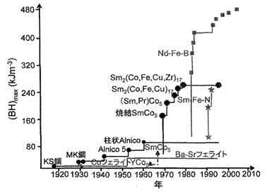 ネオジム磁石をはじめとする永久磁石の大半は、我が国において発明された。具体的には、本多光太郎と高木弘によるKS鋼(1917年)、三島徳七によるMK磁石(1931年)、加藤与五郎と武井武によるフェライト(OP)磁石(1932年)、本多光太郎、増元量及び白川勇記によるNKS磁石(1934年)、金子秀夫と本間基文による鉄・クロム・コバルト磁石(1970年)などが挙げられる。これらの成果は海外でも評価されており、1957年当時の米国大統領であったアイゼンハワーが「いままで、科学面で各国が貢献した課題は、イギリスはジェットエンジン…(中略)…日本はマグネチックスである4」とラジオ放送で賞賛の声を送るほどであった。