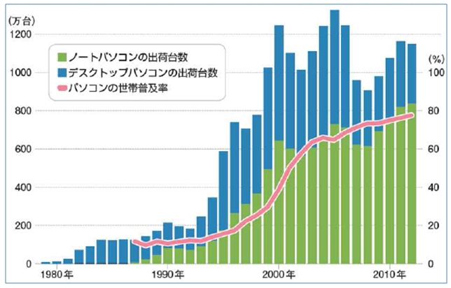 米国で生まれたPCに、日本企業が携帯性という新たな価値を付加して生まれたノートPCは、世界中に普及しわずか20年でPC市場の主流となったのである。