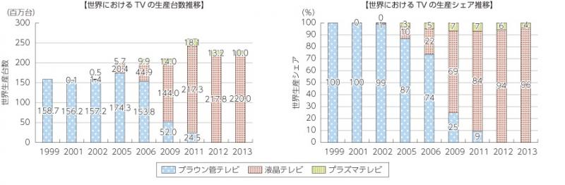 薄型テレビの中でも、低価格化・技術向上・大画面化に伴い、主流となった液晶テレビの日本国内生産台数4については、2000年には47万台にすぎなかったが、2005年には422万台、2010年には2519万台にまで達するところとなった。一方、世界では、2005年ごろから、ブラウン管テレビからの代替が進み、足元では年産2億台から2億5000万台ほどとなっている。
