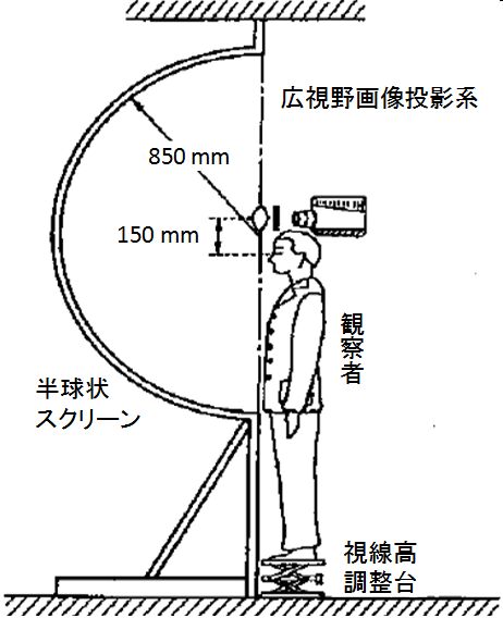 臨場感が最大となる画角と視距離を明らかにするために図1に示す測定装置を用いて検討を行った。実験装置は観察者のほぼ全視野を占める半球型のスクリーンで構成され、このスクリーン上に傾けた映像を提示する。観察者は無意識のうちに画像につられて体を傾けてしまうことからこの体の傾く角度(誘導角)を臨場感の指標として用いることとした。その結果、観察者が映像を見込む角度が20°程度から誘導角が明らかとなり始め、30°程度でかなり顕著になり、80°から100°程度で多くの映像で飽和することが分かった。このことから求められる画角は実現可能なディスプレーの大きさとのバランスから20°~30°を設計画角とすることとなった。一方、好ましい視距離について解像度が十分高い映像を用いて調べたところ設計画角に対して静止画像で2~3H(H:画面高)、動画像では4Hの距離が好まれたことからバランスを考慮して設計視距離は3Hとすることとなった。標準の視力1.0の人の弁別可能な最小の大きさは定義によれば視角にして1.0度である。したがって3Hの距離から見た際の走査線によるすだれ越しに画像を見るような妨害(走査妨害)を除くために必要な走査線数は約1100本と導かれた。この結果から、NTSC系の走査線数525本とPAL、SECAM系の625本の両者に対してできるだけ簡単な整数比を実現する1100本近辺の走査線数として1125本(有効走査線数1080本)が新方式の走査線数として採用されることとなった。