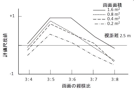 前述したように、画面を横長にし、大きくなるほど臨場感が増すことは経験的に分かっていた。しかし、適切な画角、サイズが不明であったため画面の縦横比を変えた種々のスライドを用いて主観評価を行い、これらを検証することとなった。図2に示す主観評価の結果、内容や画面面積にかかわらず3:5が最も好まれ、ついで3:6が好まれることが明らかとなった。また、画面面積が大きくなるにつれてより広いアスペクト比が好まれる傾向が確認された。この結果と、経験的に求められた映画のアスペクト比(1:1.3~1:2.7)との親和性を考慮し、16:9が導かれた。これは縦横比が3:5.33であり、経験則が実験により裏付けられたということができる。なお、湾曲スクリーンについても同時に検討したが、平面スクリーンに比べて奥行き感や自然感が向上する効果は認められたものの、画像内容に依存するところが大きく、一般的な湾曲率が見いだせなかったことからアスペクト比16:9の平面スクリーンが採用されることとなった。