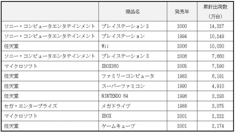 イノベーション100選 トップ10 戦後復興期 高度経済成長期 安定成長期 現代まで 印 刷 アンケート投票トップ10 家庭用ゲーム機・同ソフト統計参考文献等主な受賞歴イノベーションに至る経緯概要統計表1 家庭用据え置き型ゲーム機累計販売(出荷)台数 注)2012年末現在 出典:一般社団法人コンピュータエンターテインメント協会「2013CESAゲーム白書」(2013)外による 統計参考文献等主な受賞歴イノベーションに至る経緯概要